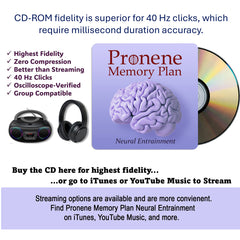 The album is also available on iTunes and other streaming services; however, the streaming options are at lower audio resolutions due to the uncontrollable nature of those platforms. This CD-ROM delivers uncompressed high-fidelity neurostimulation, which is the highest fidelity option available. These sounds are identical to audio formats used in 40 Hz “Gamma” audio click research studies.