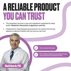 Our patent-pending nighttime formula blends melatonin, resveratrol, magnesium, and zinc to promote deep sleep, memory consolidation, immune health, and inflammation control.